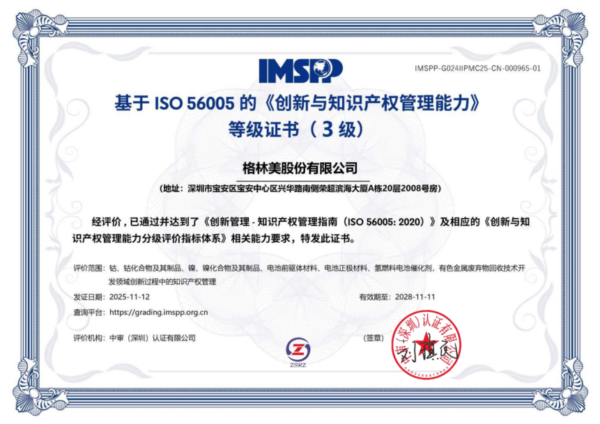 格林美股份有限公司通过ISO56005创新与知识产权管理能力(3级)认证