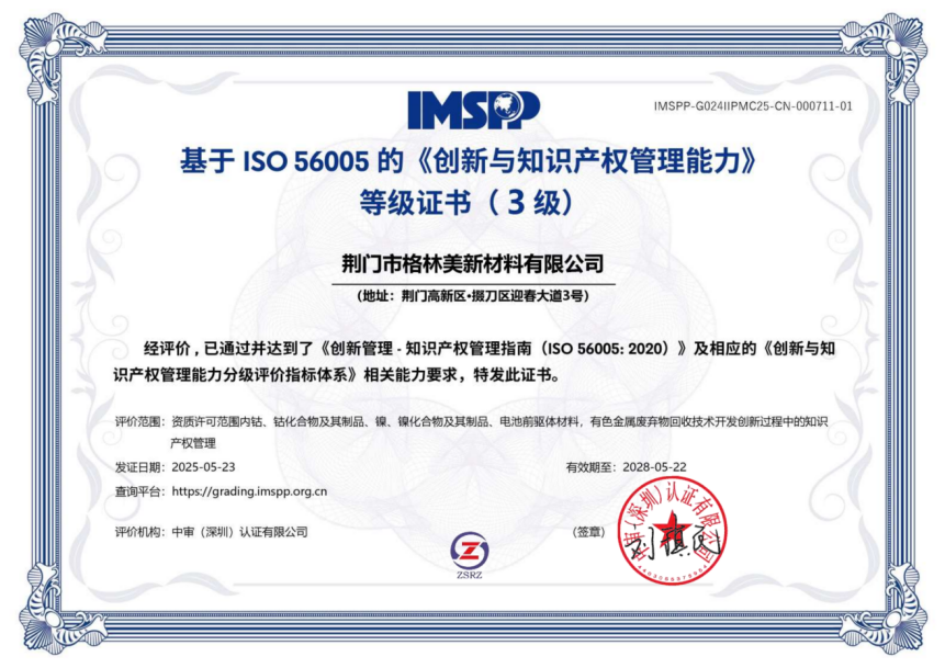 荆门市格林美新材料有限公司通过ISO56005创新与知识产权管理能力(3级)认证