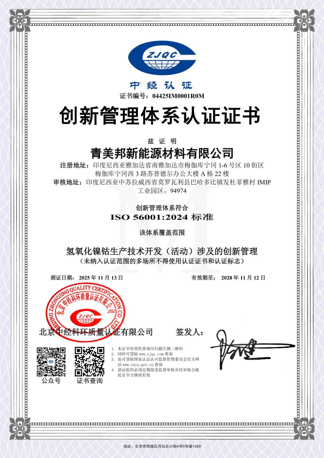 青美邦新能源材料有限公司通过ISO56001创新管理体系认证