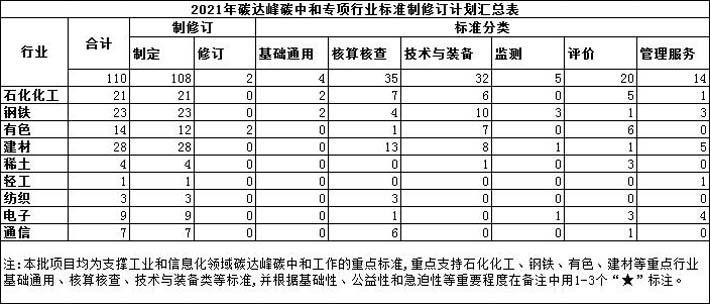 为发挥标准在推进工业领域碳达峰碳中和工作的*和规范作用,工业和信息化部编制完成了2021年碳达峰碳中和专项行业标准制修订项目计划(下称“计划”)。该计划共涉及到有色、稀土、石化化工、钢铁、建材、轻工、纺织、电子和通信9个行业,而这些行业共有110个项目。具体内容如下: