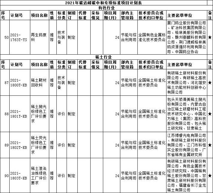 2.稀土行业:项目4个,项目名称分别为稀土靶材回收料,稀土抛光粉绿色工厂评价要求,稀土荧光粉绿色工厂评价要求,稀土湿法冶炼绿色工厂评价要求。